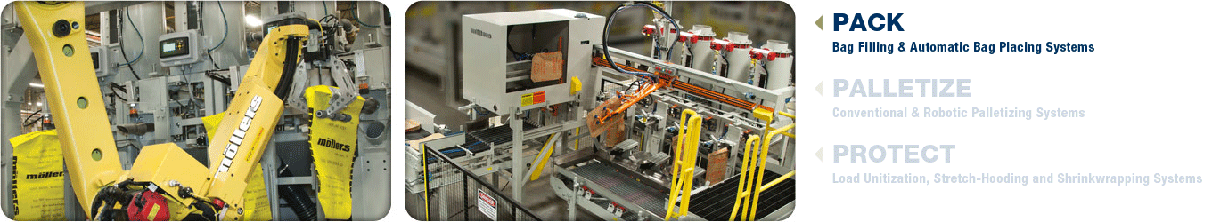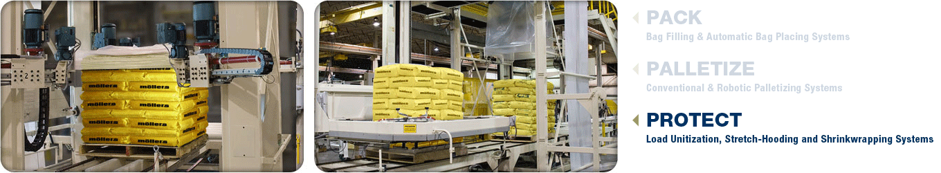 Mollers North America is your source for the design, development, manufacture and installation of bag and unit load material handling systems. Our line of products includes a comprehensive line of bagging, conveying, palletizing, stretch-hooding, stretchwrapping and shrinkwrapping systems.