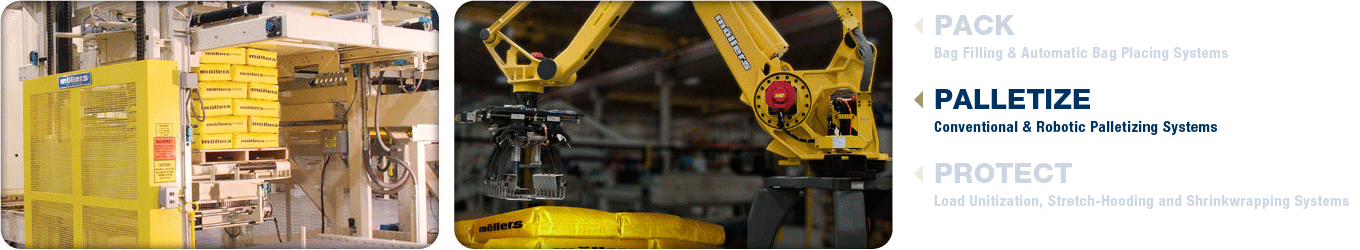Mollers North America is your source for the design, development, manufacture and installation of bag and unit load material handling systems. Our line of products includes a comprehensive line of bagging, conveying, palletizing, stretch-hooding, stretchwrapping and shrinkwrapping systems.